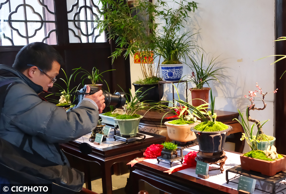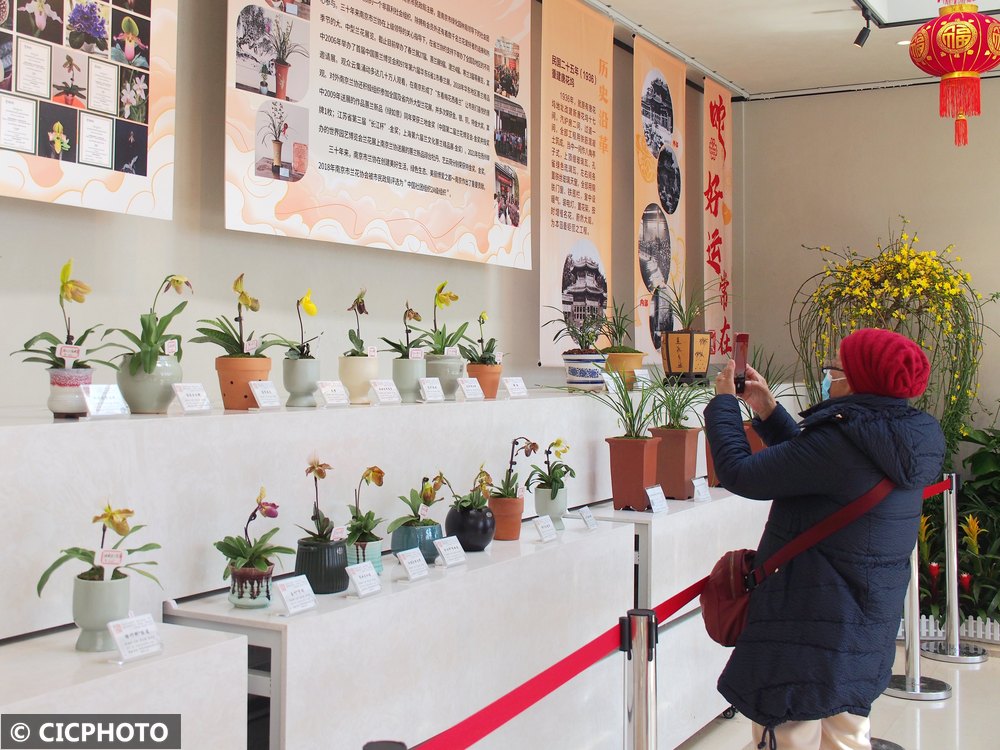 ↑2025年2月23日,兰花爱好者在苏州古典园林沧浪亭举办的春兰展上赏花拍照。CICPHOTO/王建中 摄