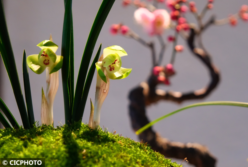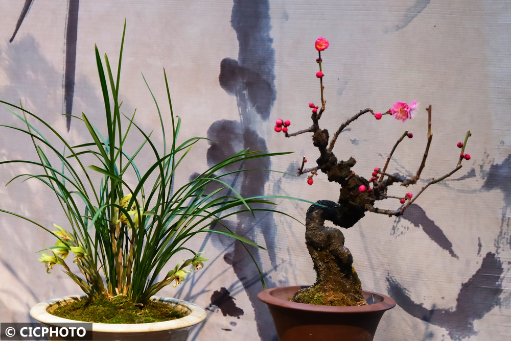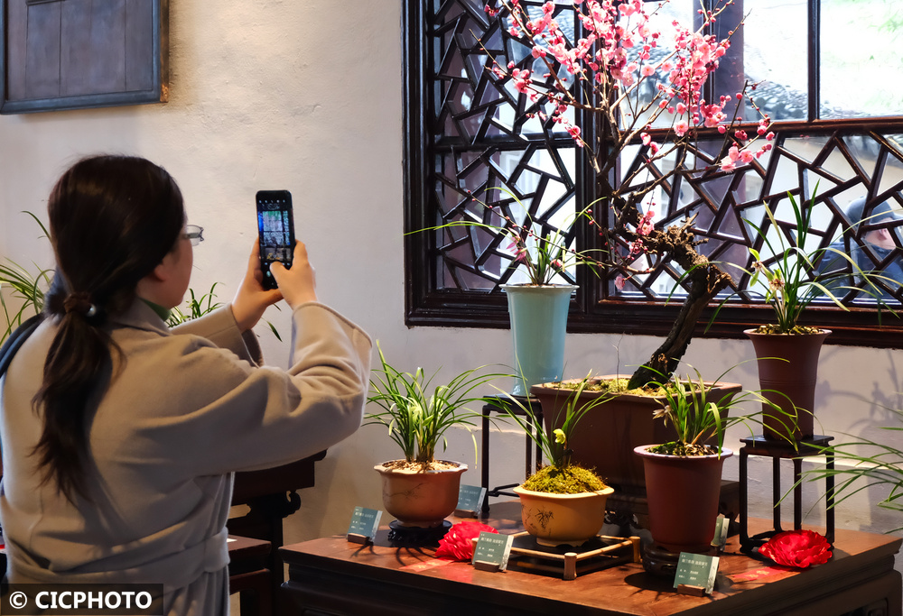 ↑2025年2月23日,在苏州古典园林沧浪亭举办的春兰展上,梅花与兰花相映成趣。CICPHOTO/王建中 摄