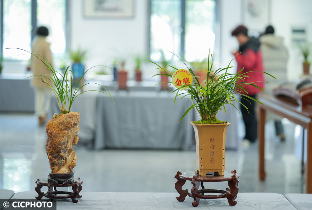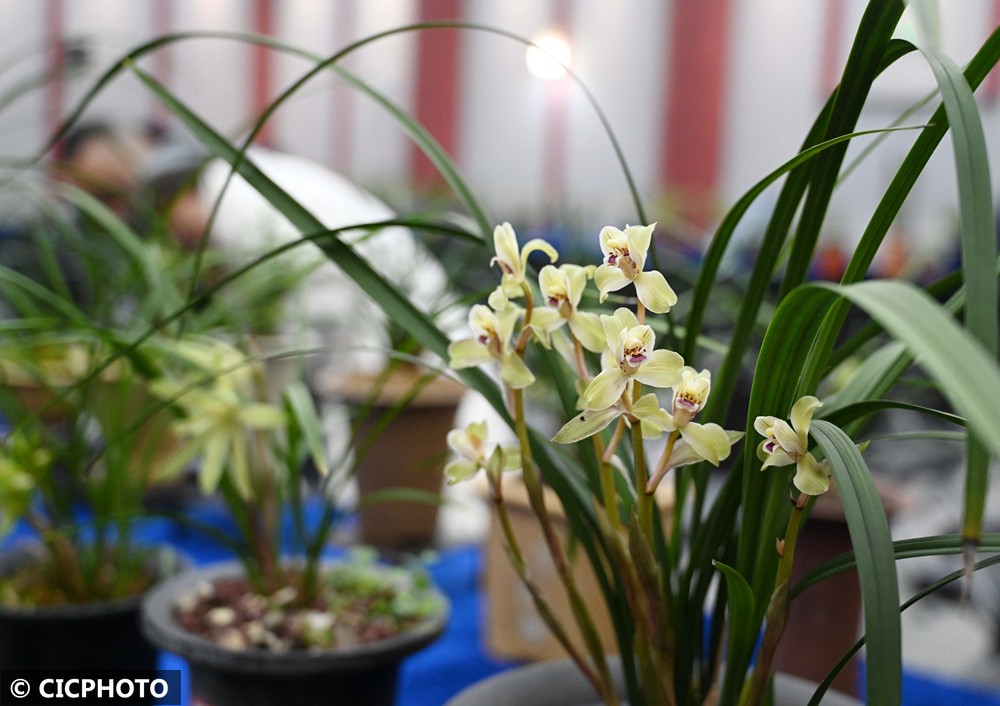 ↑2025年2月20日在浙江省金华市武义县履坦镇坛头村举办的春兰展上拍摄的兰花。CICPHOTO/张建成 摄
