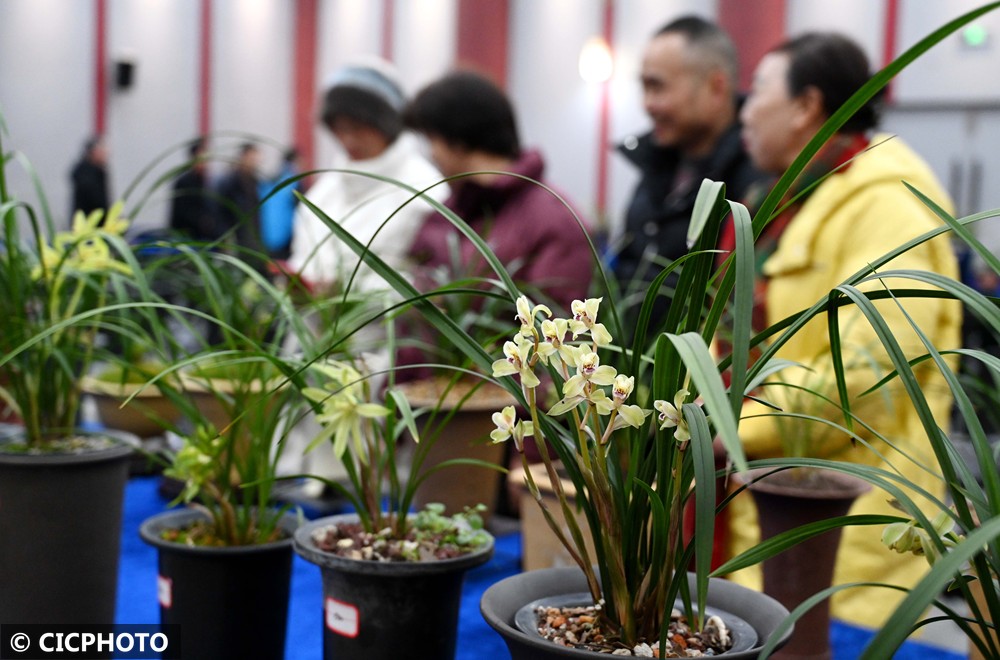 ↑2025年2月20日,兰花爱好者在浙江省金华市武义县履坦镇坛头村举办的春兰展上赏花交流。CICPHOTO/张建成 摄