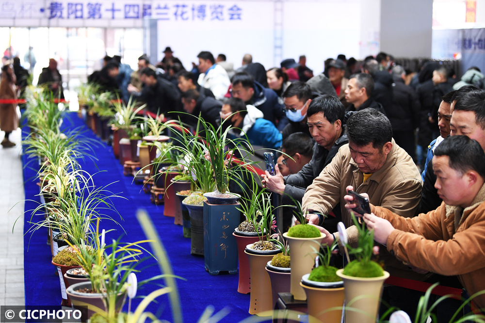 ↑2025年2月8日,兰花爱好者在贵州省贵阳市南明区举办的兰花博览会上赏花。CICPHOTO/赵松 摄