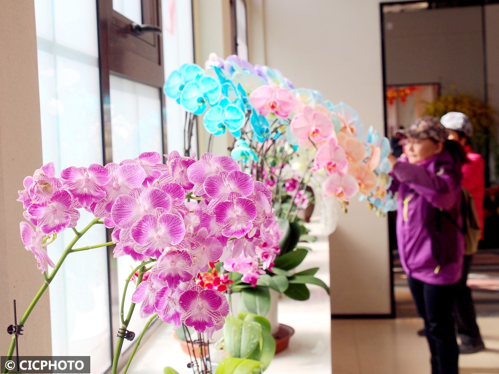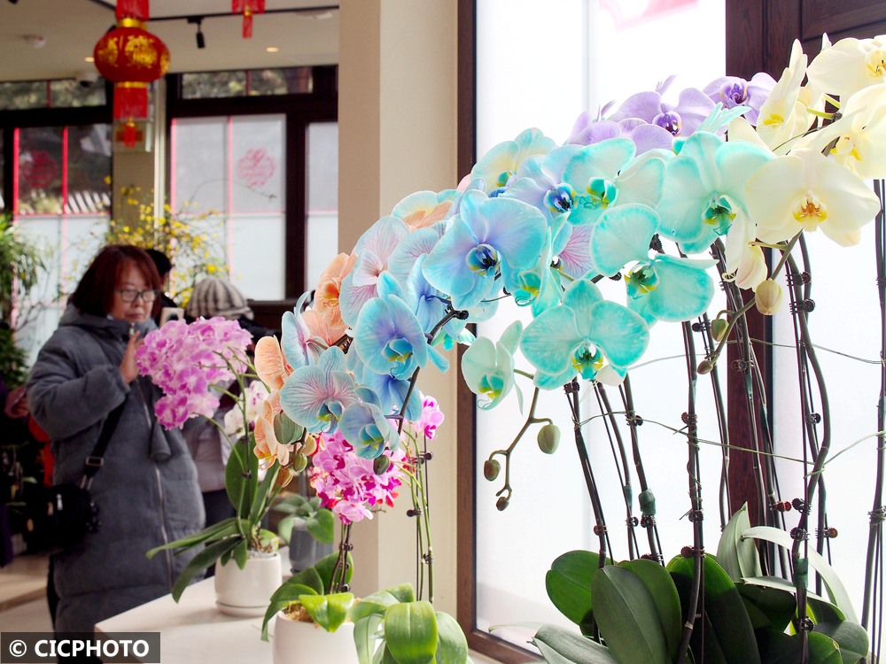 ↑2025年2月8日,兰花爱好者在贵州省贵阳市南明区举办的兰花博览会上赏花拍照。CICPHOTO/赵松 摄
