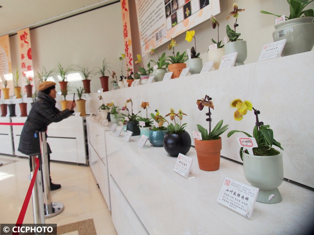 ↑2025年2月26日,兰花爱好者在北京中山公园唐花坞举办的乙巳春季兰花展示推介会上赏花拍照。CICPHOTO/杜建坡 摄