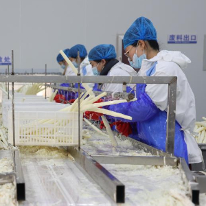 在河北农速源冷链物流有限公司的净菜生产线,工人将加工好的白菜装袋。新华社发(刘娟 摄)