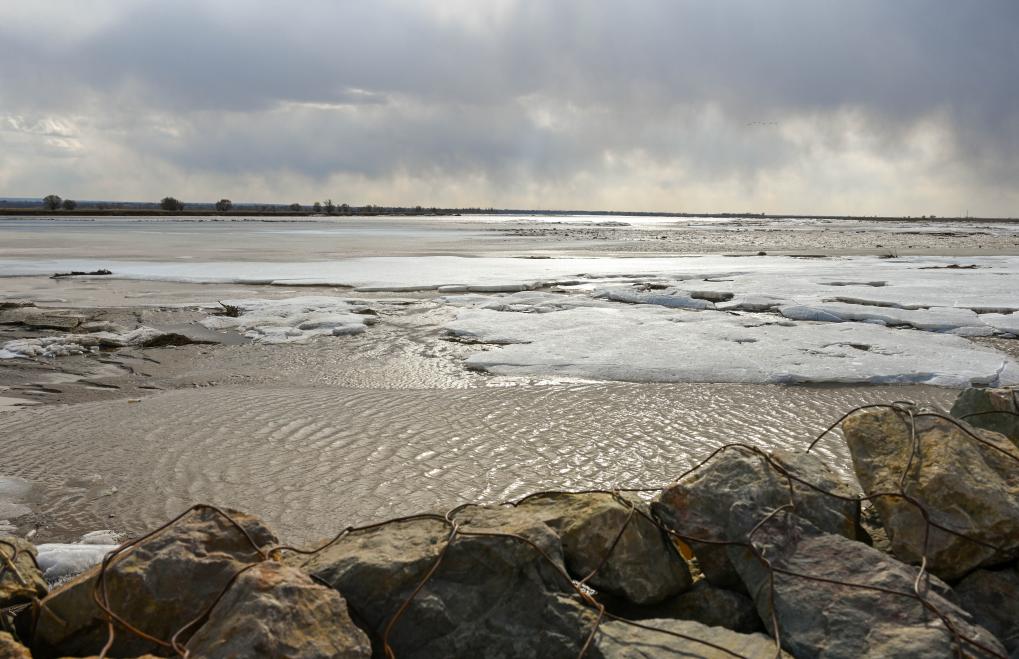 宽广的河道内,河床中间的主水槽已经解冻,河水缓缓流淌,泛起粼粼波光;水面不时漂来大小、形状不一的冰块,它们相互撞击,发出清脆的“刺啦”声。河岸附近的河滩积冰有的由白变灰、冰层逐渐变薄。赤麻鸭等候鸟在冰面上悠闲踱步。仰头偶尔能看到,十几只天鹅排成人字形,缓缓飞过。