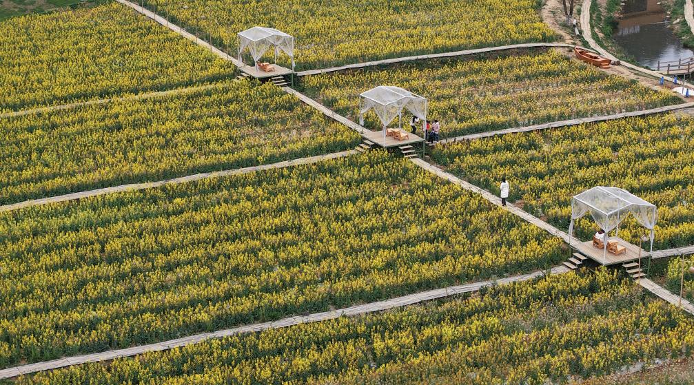 2023年4月7日,游客在安徽省黄山市徽州区西溪南湿地踏青赏景。