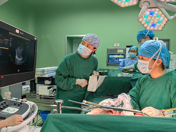 作者(右一)在超声引导下给患者做肝肿瘤射频消融手术。
