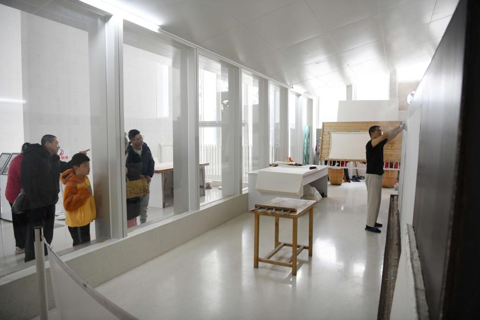 3月15日,游客在泾县宣纸文化园观看宣纸晒纸工艺展示。新华社记者 刘军喜 摄