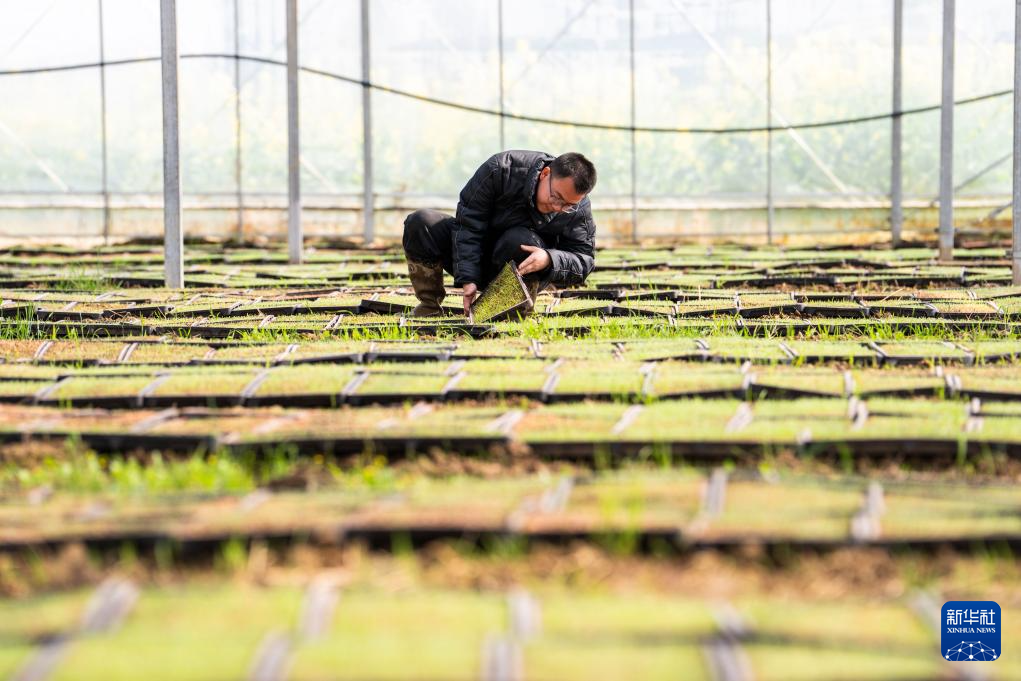 3月20日,在常德市汉寿县龙潭桥镇兴龙社区,刘含在育秧大棚观察秧苗长势。新华社记者 陈思汗 摄