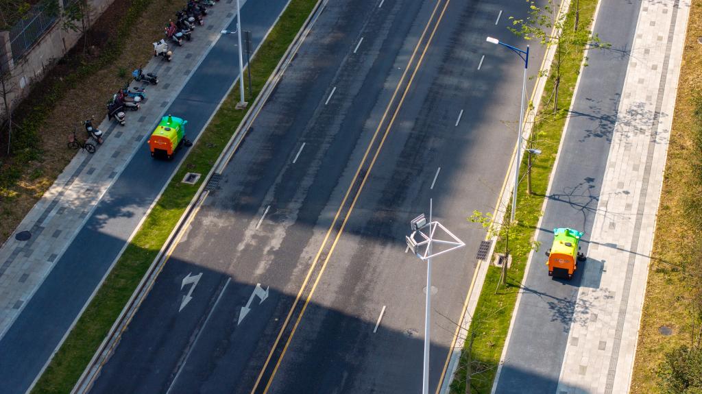 3月19日,在深圳市坪山区坑梓街道,环卫机器人在清扫街道(无人机照片)。