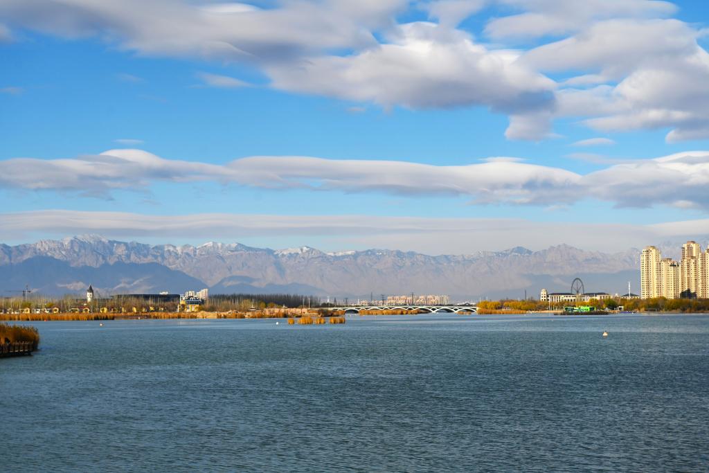 这是2024年11月26日在银川市阅海湖畔拍摄的雪后的贺兰山。白雪覆盖的贺兰山与银川市区的阅海湖交相辉映,宛如一幅山水画卷。新华社记者 毛竹 摄
