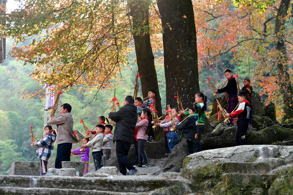 在桂黔乌英苗寨教学点“芦笙文化进校园”课堂上,师生们在古树下吹奏芦笙(2021年12月14日摄)。新华社记者 黄孝邦 摄