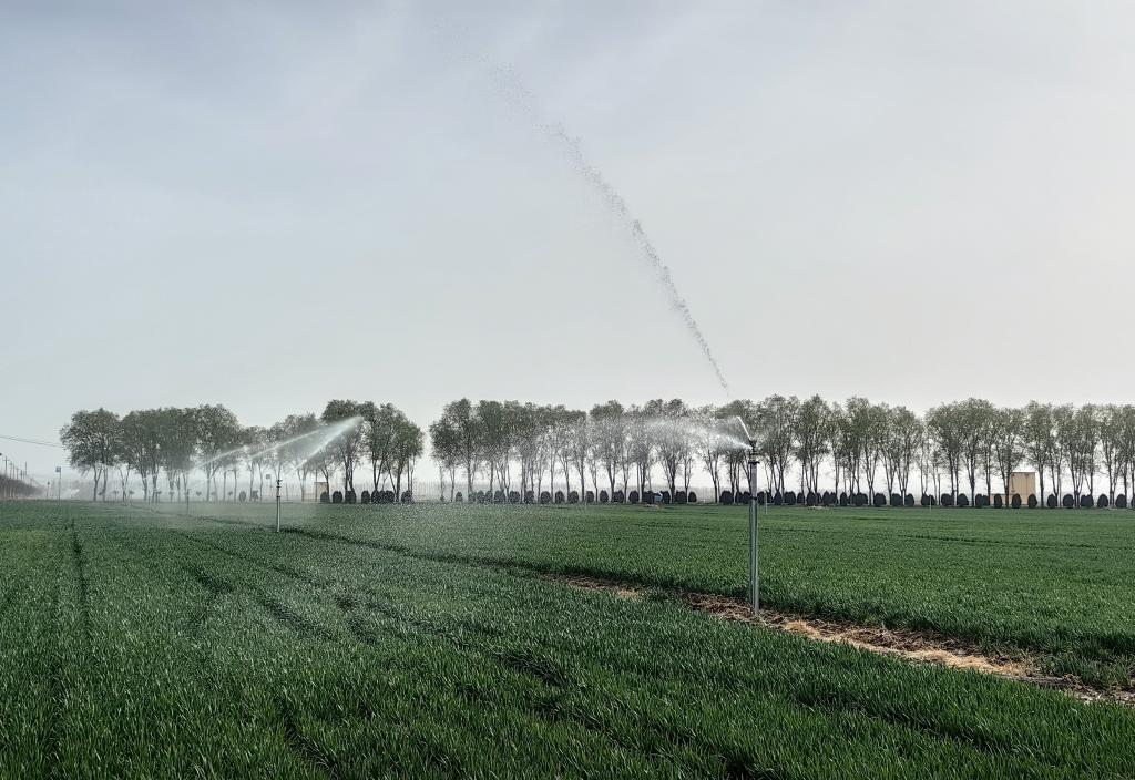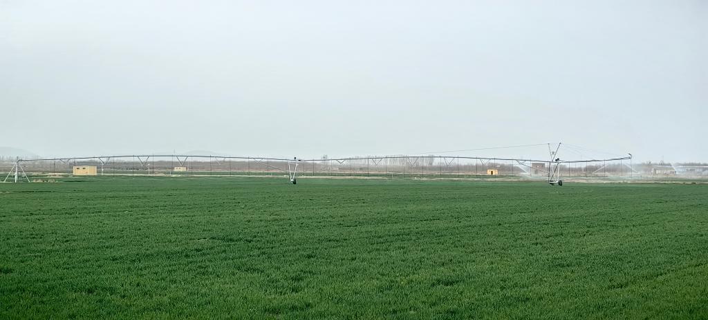 一块麦田里,两三米高、几十米长的指针式喷灌设备,像钟表的指针一样围绕中心点旋转,将麦田揽入怀中,伞状喷头喷出的水雾均匀洒下,滋润着愈发挺拔舒展的麦苗。