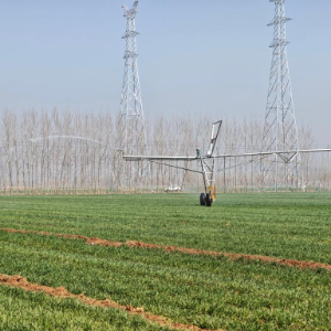 王方带记者走近观察,只见这台设备的钢架主横梁下等距悬挂许多根垂直喷头,正淅淅沥沥向外喷洒水雾,十分细密,离近才能看清。她介绍,这台设备是指针式喷灌机,它的灌溉方式就像下小雨一样,用水量少,农作物还能“喝”饱水,灌溉效率和节水能力都能兼顾。