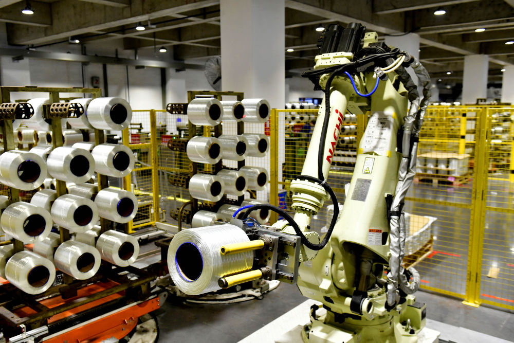 2025年3月18日,在位于山东省泰安市的泰山玻璃纤维有限公司,工业机器人在搬运玻璃纤维产品。新华社记者 郭绪雷 摄