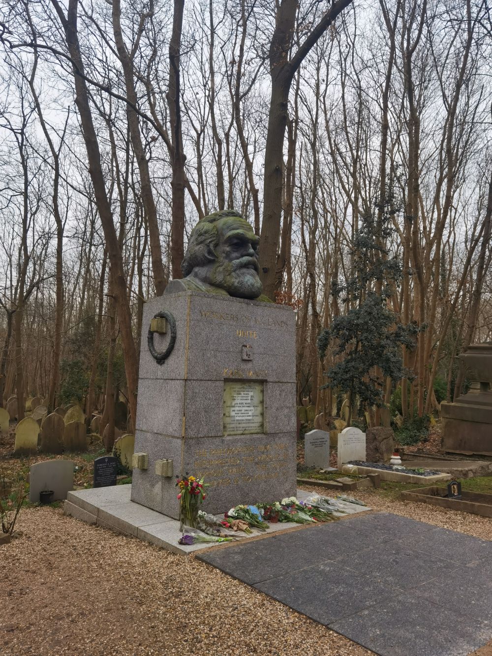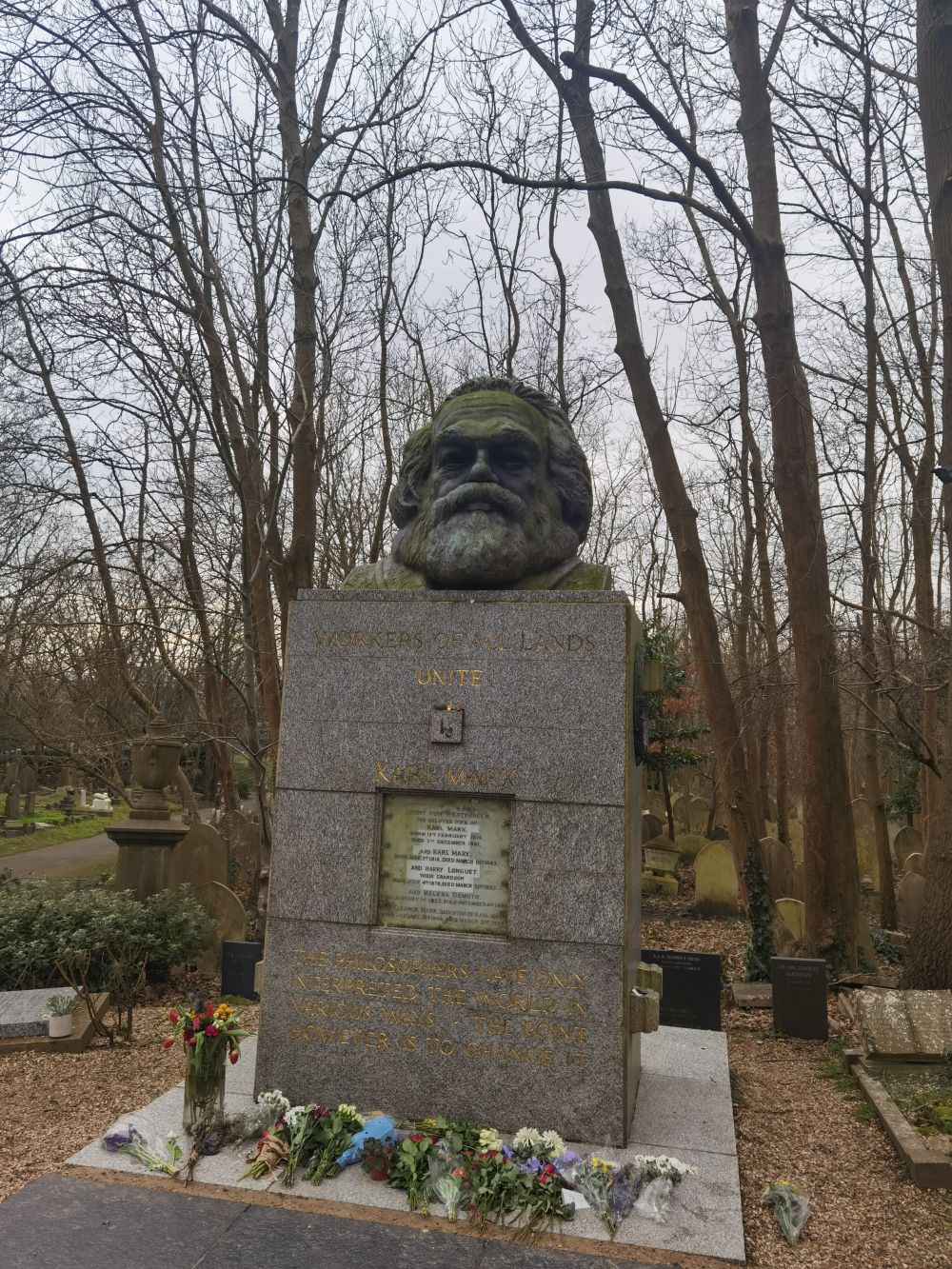 马克思墓的墓碑与塑像是一体的,上端镌刻着“全世界无产者,联合起来(Workers of all lands unite)”,下端写着“哲学家们只是用不同的方式解释世界,而问题在于改变世界(The philosophers have only interpreted the world in various ways-the point however is to change it)”。目测,墓碑应该是这个偏僻墓园里最气派的了。墓前有不少人们献上的鲜花,有人还留有卡片。
