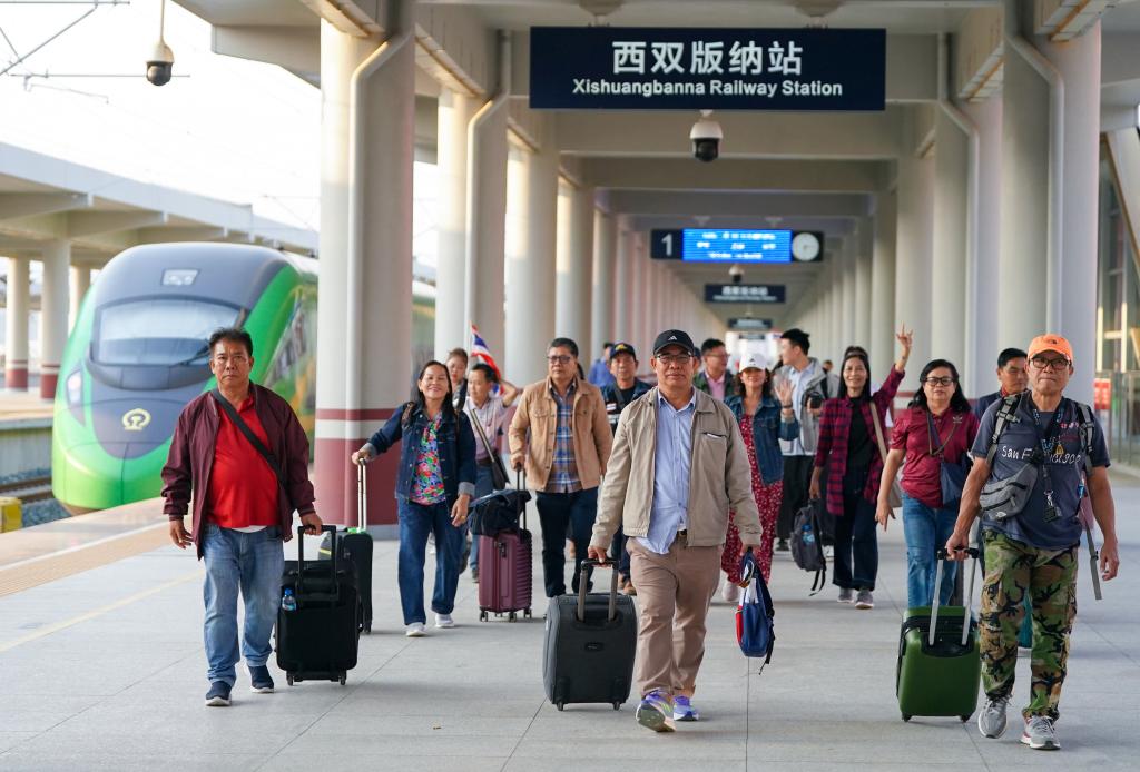 2月18日,来自泰国和老挝的游客抵达中老铁路西双版纳站。新华社记者陈欣波 摄