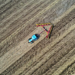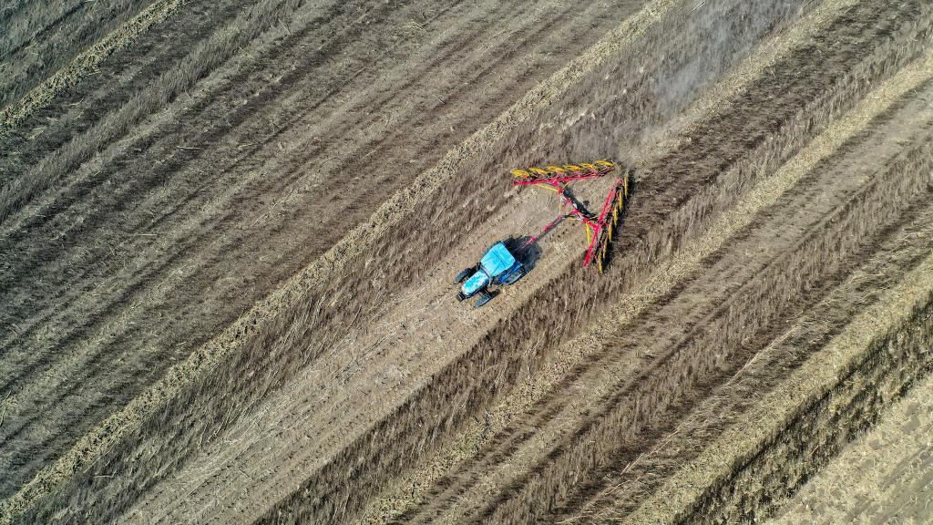 农民在吉林省公主岭市范家屯镇驾驶农机整理耕地里的秸秆(无人机照片)。新华社记者 张楠 摄