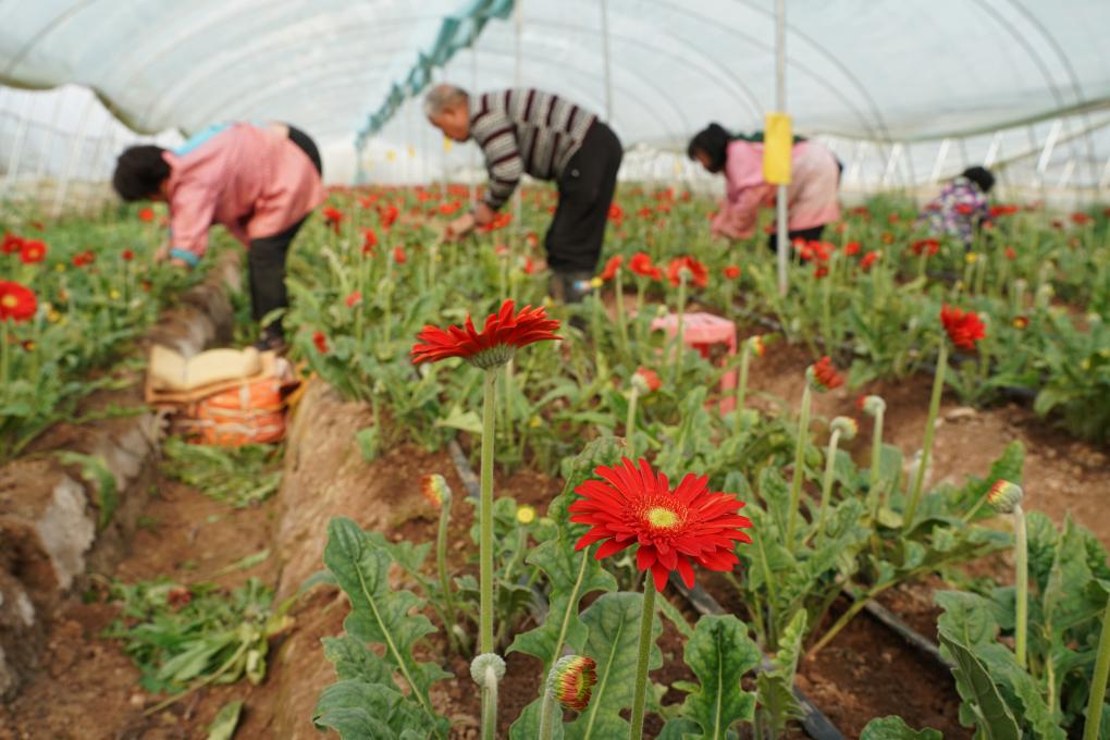 在西安市长安区魏寨街道一家庭农场,种植户在管护非洲菊。新华社记者邵瑞 摄