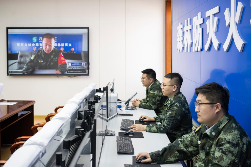 4月14日,在位于哈尔滨市的龙江森工集团森林防灭火指挥中心,工作人员通过视频连线对下级林业局公司的日常防火情况进行调度。新华社记者谢剑飞 摄