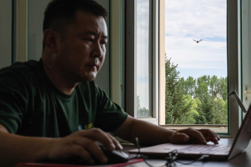 在龙江森工集团通北林业局公司八二林场,工作人员在室内操控无人机进行巡查监测作业(2024年7月24日摄)。新华社记者谢剑飞 摄