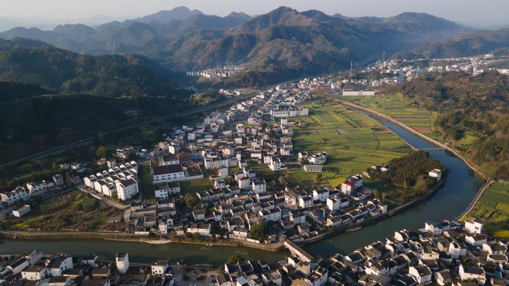这是2025年3月24日在安徽省黄山市歙县拍摄的北岸廊桥和周边风景(无人机照片,画面下方为北岸廊桥)。新华社记者 张端 摄