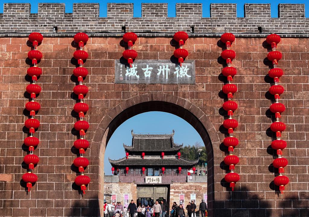 大红灯笼扮靓徽州古城(2024年1月25日摄,无人机照片)。新华社发(施亚磊 摄)