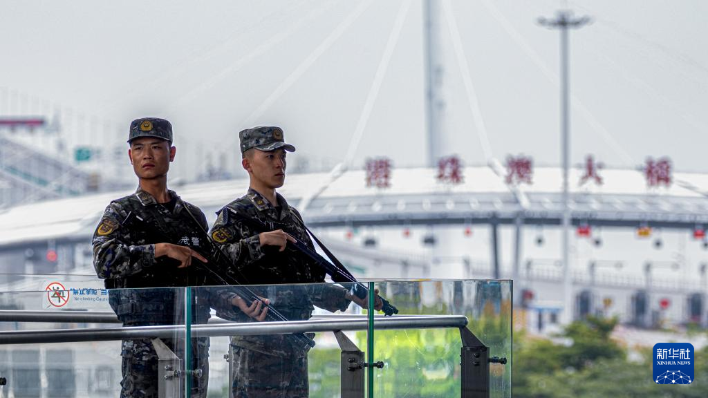 武警广东总队珠海支队执勤一中队士兵在港珠澳大桥哨位执勤(2024年5月18日摄)。新华社发(任森 摄)