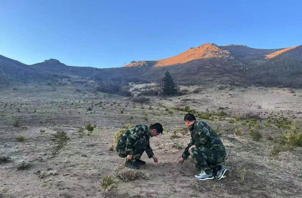 4月29日,内蒙古克什克腾旗黄岗梁自治区级自然保护区内,林业人员在查看蒙古郁金香生长情况。(孙华 摄)