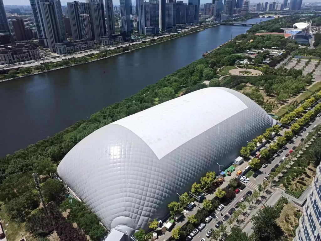 图为覆盖于玉带河大街“调蓄池+泵站”工地上方的基坑气膜。(中铁十六局供图)