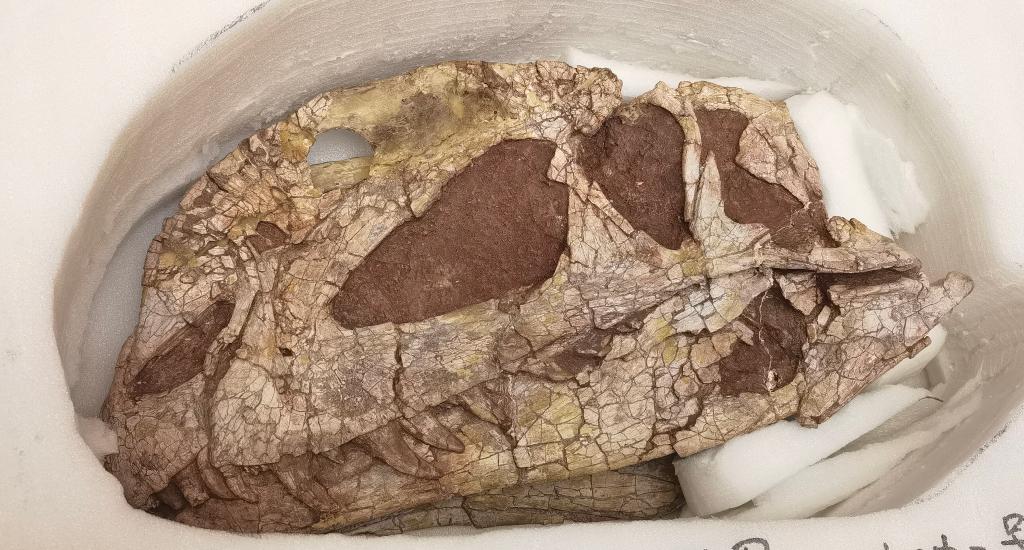 图为18日开箱的三叠中国龙头骨标本。新华社记者陈爱平摄