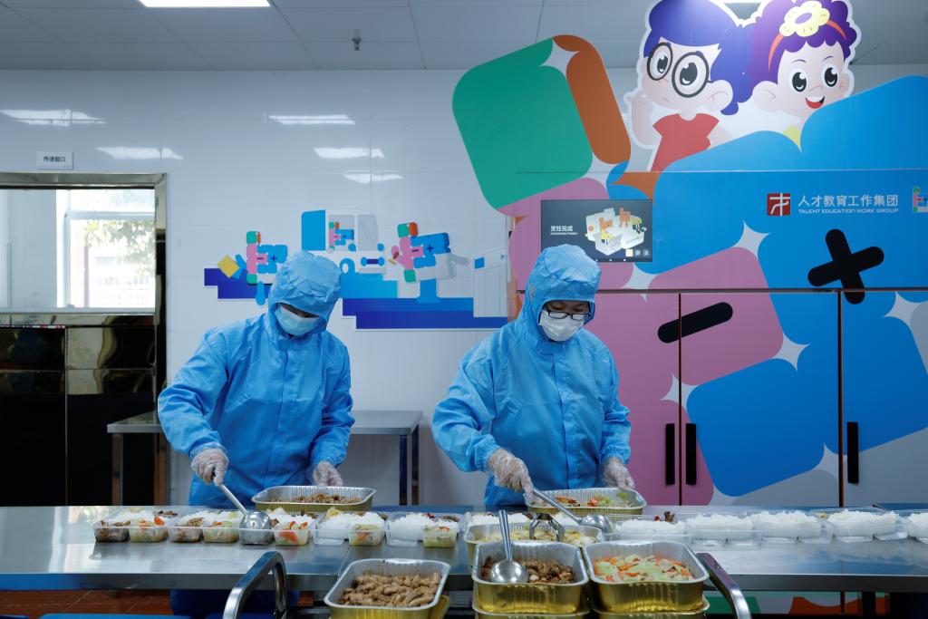广州市黄埔区开元学校的智慧食堂里,工作人员正在分装“数字大厨”做好的饭菜。新华社发