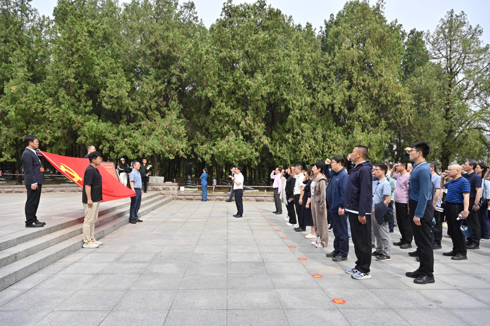 走出纪念馆,参训同志来到位于烈士陵园中央的英烈亭前,这里安葬着2865名革命烈士的忠骨,但墓碑上刻有烈士名字的只有103块,著名抗日英烈陈若克与她出生仅20天的女儿长眠于此。参训同志分队站立英烈亭前,向革命烈士三鞠躬并敬献花篮。随后,面向党旗集体重温入党誓词,用铮铮誓言宣告,时刻要牢记先是“革命人”再是“新闻人”、先是“党的人”再是“新华人”的角色身份。