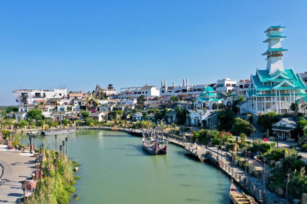 景区内,融合汉代建筑风格与异域元素的古堡建筑错落有致。古堡内复刻汉代市井街巷,设有商铺、码头、驿站等场景。作为全景交互式演艺《千年始发港》的主舞台,古堡区域每晚上演商队出港、异域歌舞、汉风婚礼等剧情。当身穿古代服饰的商家、渔民、水手,以及装扮奇异的各国商人从你身旁走过,仿佛打开时光之门。