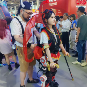项戴乾坤圈,身披混天绫,30日上午,在第21届中国国际动漫节的展览现场,一位下肢瘫痪的COSER(动漫角色扮演者)向公众展现了哪吒的形象。让她站立行走的不是风火轮,而是外骨骼机器人。