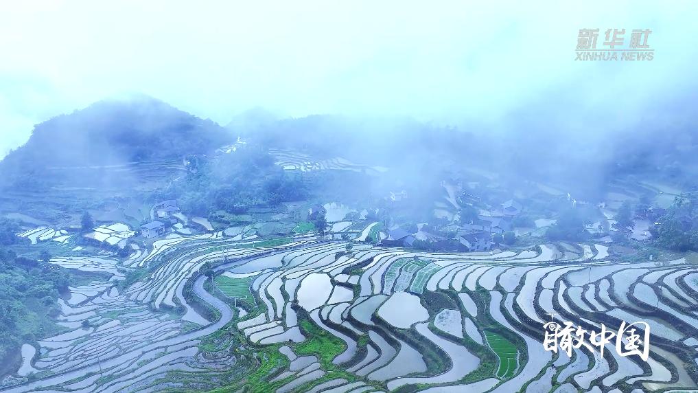 初夏时节,位于湖南省东安县舜皇山腹地的塘家梯田完成蓄水,梯田水满田畴,如链似带,与青山、村落、云雾相映成趣,美不胜收。