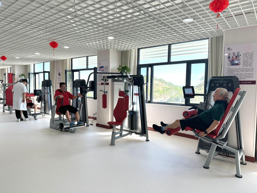 在海南南平健康养生产业园,老年人在专业工作人员指导下健身。新华社记者陈凯姿 摄