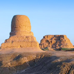 莫尔寺遗址,位于新疆喀什市东北30多公里处莫尔村附近一处洪积台地上。最显眼的是两座土坯佛塔,一圆一方,遥遥望去,如两枚巨大印章盖在苍茫荒原上。
