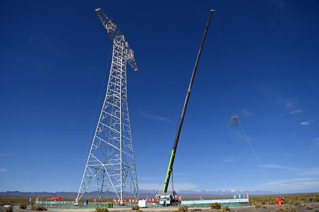 在新疆哈密市伊吾县,哈密—重庆±800千伏特高压直流输电工程施工现场,工程建设人员进行铁塔组立作业(2024年7月12日摄)。新华社发(马元 摄)
