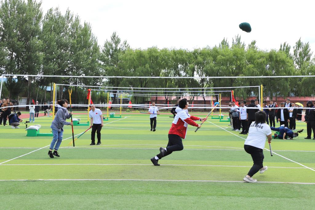 在赫哲族第十二届乌日贡大会现场正在进行叉草球项目比赛。新华社记者徐凯鑫摄