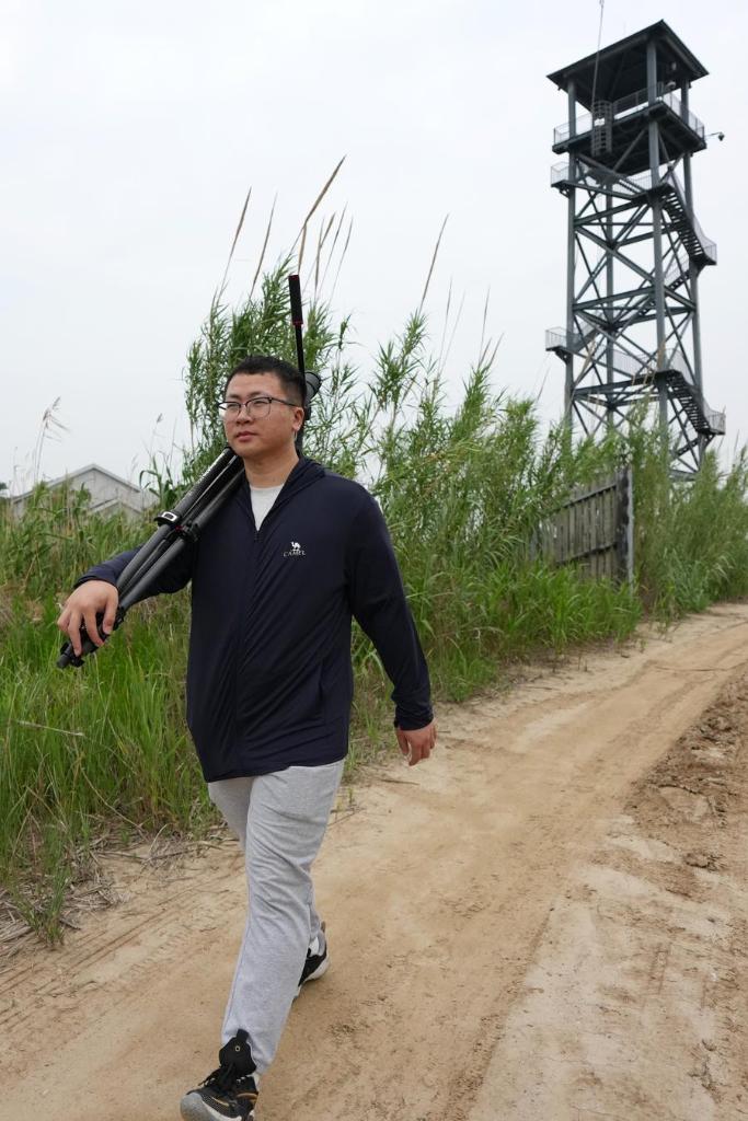 6月7日,在江苏盐城湿地珍禽国家级自然保护区,顾佳林带着望远镜外出巡护。
