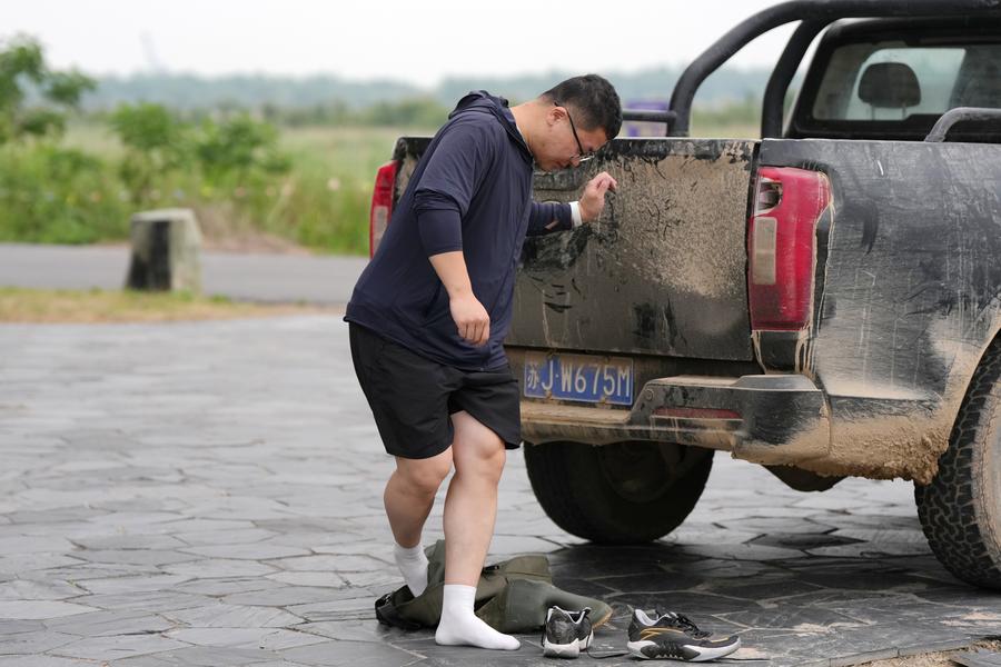 6月7日,顾佳林在江苏盐城湿地珍禽国家级自然保护区巡护监测时更换下水裤。