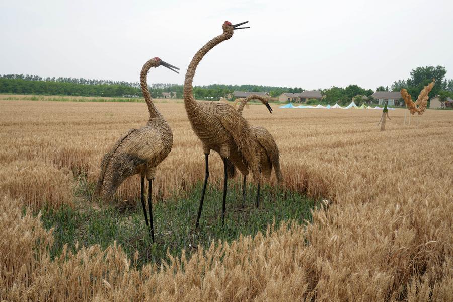 这是在江苏盐城湿地珍禽国家级自然保护区西侧的兴农村拍摄的丹顶鹤造型艺术装置(6月7日摄)。