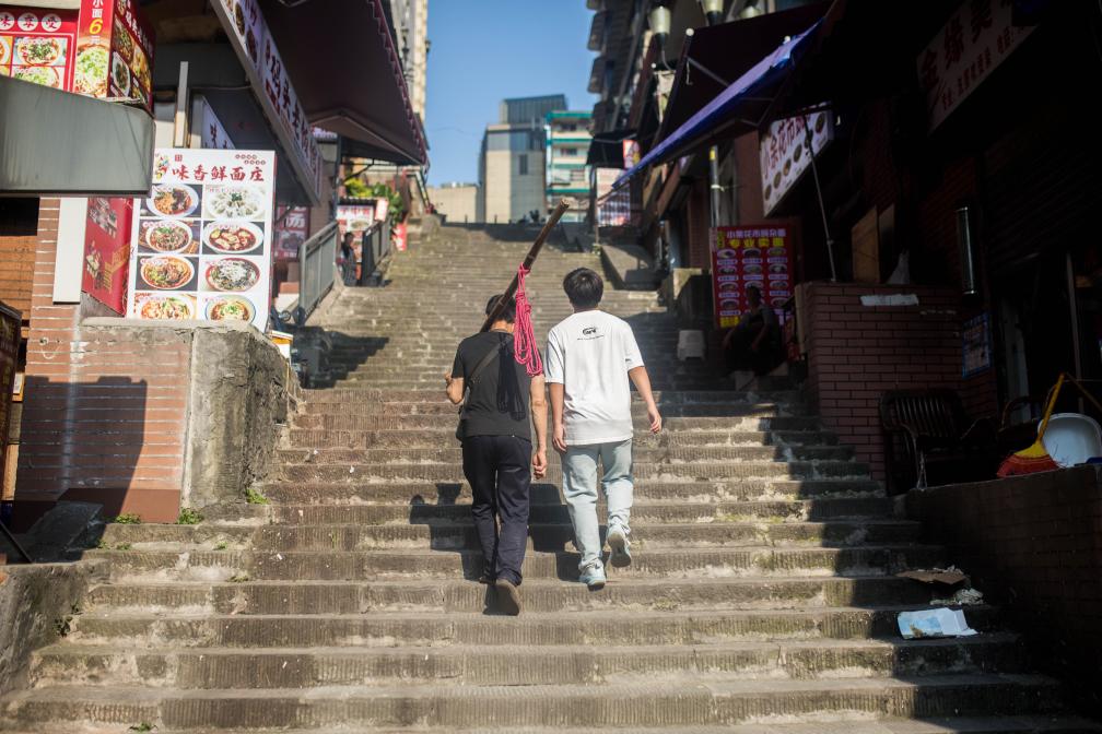 ↑2025年6月14日,冉光辉(左)和冉俊超走上石阶。
