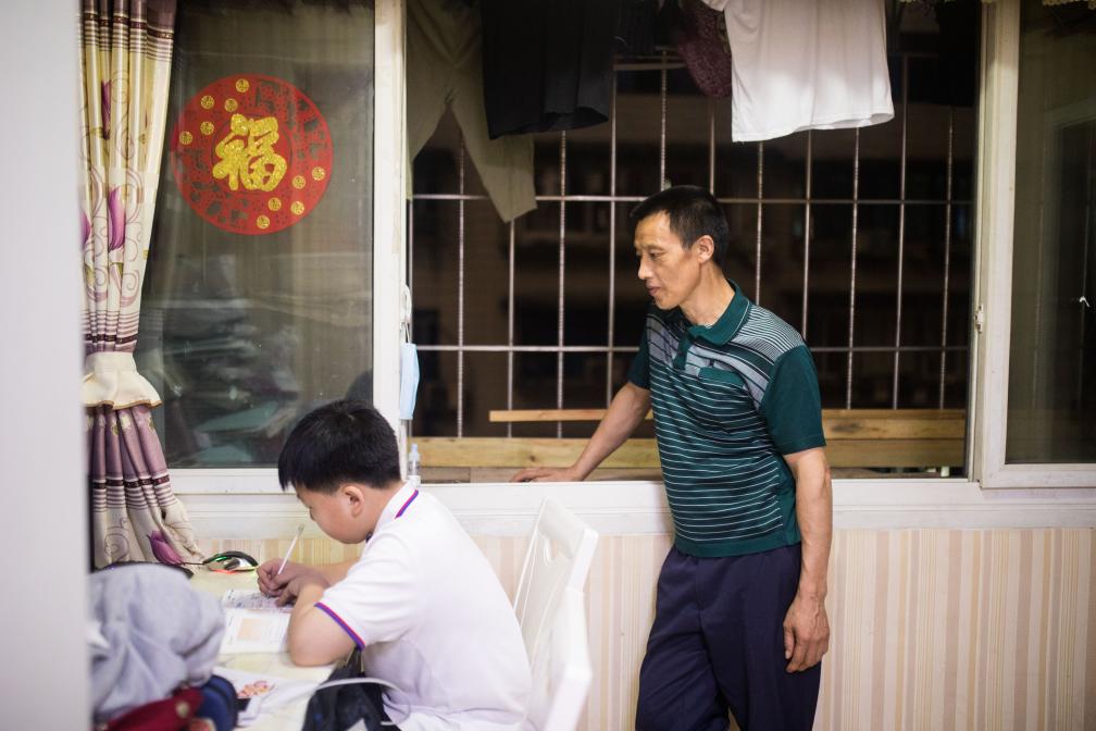 ↑2020年6月9日,冉光辉在自己的房子里默默看着儿子写作业。