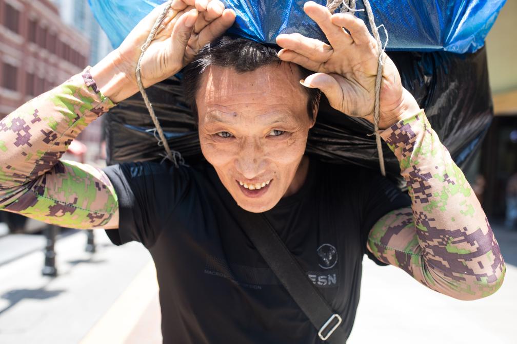 ↑2015年4月4日,冉光辉扛着重物走下楼梯。
