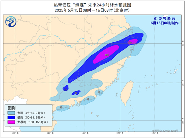 降水预报:6月15日08时至16日08时,浙江大部、江西大部、上海、福建西北部和南部、安徽东南部、湖南东南部、广东大部、广西东部等地的部分地区有大到暴雨,其中,江西中北部、浙江中部等地的局部地区有大暴雨(100~150毫米)。上述部分地区伴有短时强降水(最大小时降雨量20~50毫米,局地可超过70毫米),局地有雷暴大风等强对流天气。