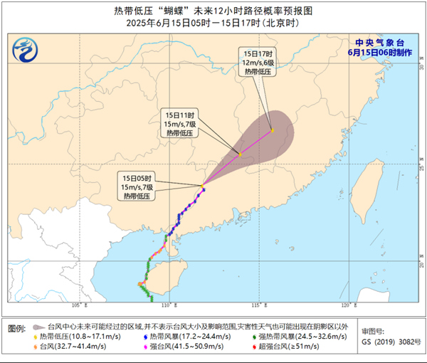 据中央气象台消息,今年第1号台风“蝴蝶”已于今天(6月15日)早晨5点钟在广西壮族自治区贺州市八步区境内减弱为热带低压,其中心位于北纬23.9度、东经111.8度,最大风力有7级(15米/秒),中心最低气压为995百帕。