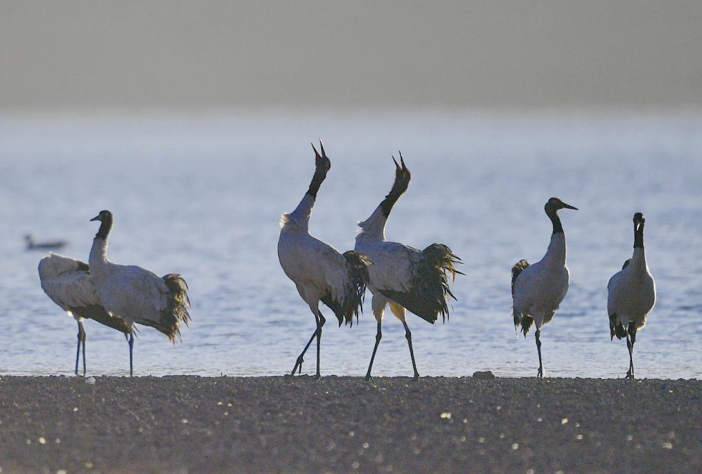 这是清晨在拉萨市林周县虎头山水库拍摄的越冬黑颈鹤。西藏拉萨市林周县位于拉萨河上游及澎波河流域,平均海拔约4200米,是黑颈鹤主要的越冬地之一(2023年12月5日摄)。新华社记者 姜帆 摄