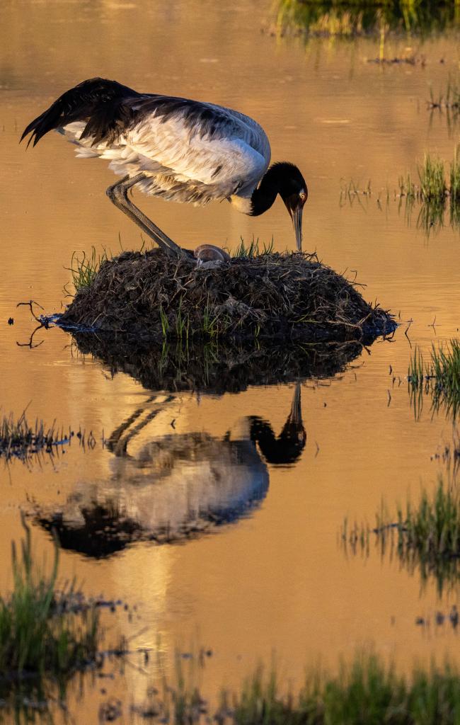 图片中的这对黑颈鹤夫妇已连续8年在那曲市申扎县申扎藏布湿地营巢育雏,并受到了普遍关注,每年都有摄影师前往拍摄。2024年,我们拍到了它们孵蛋的画面。后来听当地野保员说,孵出的小鹤在两个多月大的时候不幸夭折,这突如其来的打击使得雌鹤抑郁了很长时间,有时会无缘无故地攻击配偶,有时还会拔掉自己的尾羽,曾经形影不离的夫妻俩很长时间不窝在一起休息……幸运的是,如今的它们已走出悲伤。2025年6月4日,我们又拍到了它们雏鸟出壳的瞬间,如今,新出生的小家伙正在茁壮成长。